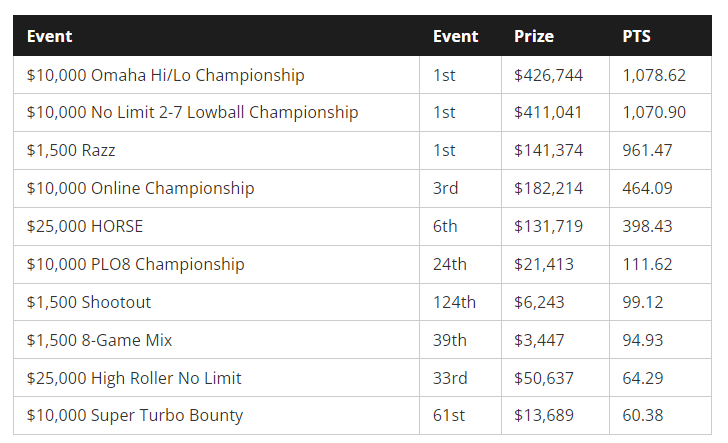 O Αμερικάνος επαγγελματίας παίκτης πραγματοποίησε μια εντυπωσιακή πορεία στην φετινή διοργάνωση με 3 bracelets, 5 final tables, 5 εξαψήφια σκορ και συνολικά 17 cashes για $1.449.773!