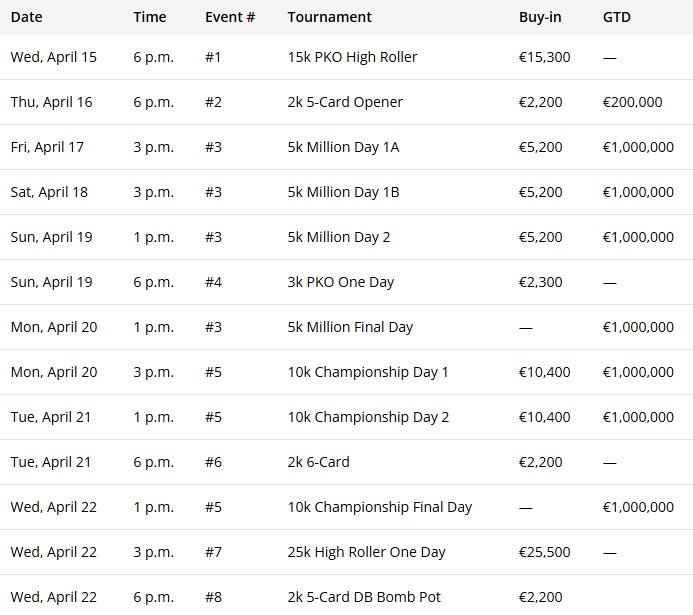 Το πρόγραμμα περιλαμβάνει οκτώ high stakes τουρνουά, με δύο events να ξεχωρίζουν: το €5.000 “Million” event και το €10.000 Championship, αμφότερα με εγγυημένα έπαθλα €1.000.000. Η δράση ανοίγει με ένα €15.300 PKO High Roller, ενώ το φεστιβάλ συμπληρώνεται από επιπλέον events υψηλών stakes και satellites καθ’ όλη τη διάρκεια της εβδομάδας.