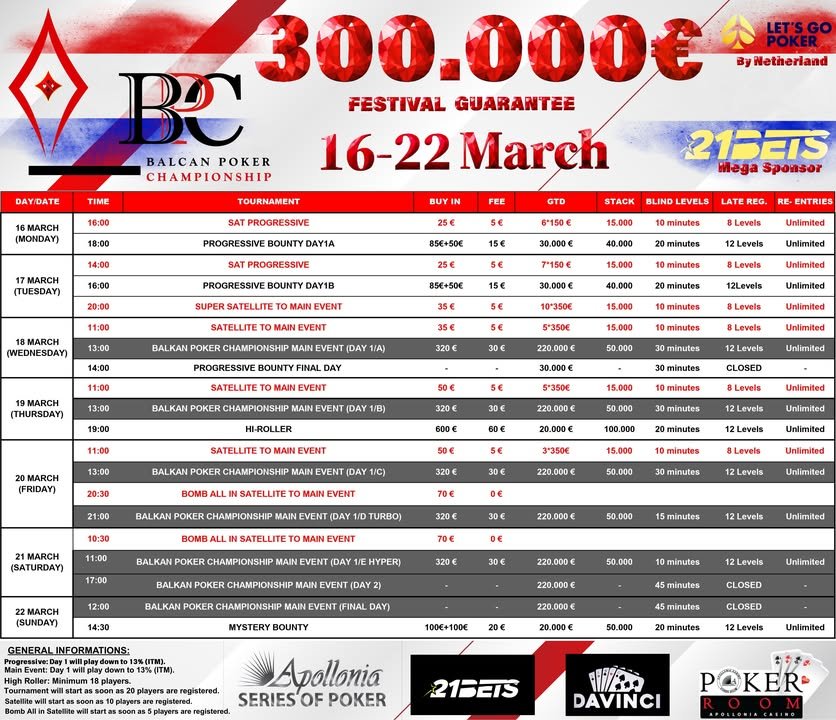 Το Apollonia Hotel & Casino Gevgelija θα αποτελέσει το επίκεντρο της δράσης από 16 έως 22 Μαρτίου, φιλοξενώντας παίκτες από κάθε γωνιά της Ευρώπης σε ένα επταήμερο γεμάτο ποικιλία τουρνουά, διαφορετικά formats και έντονο αγωνιστικό ρυθμό. Το συνολικό festival guarantee ανέρχεται στις €300.000, επιβεβαιώνοντας τις υψηλές φιλοδοξίες της διοργάνωσης.