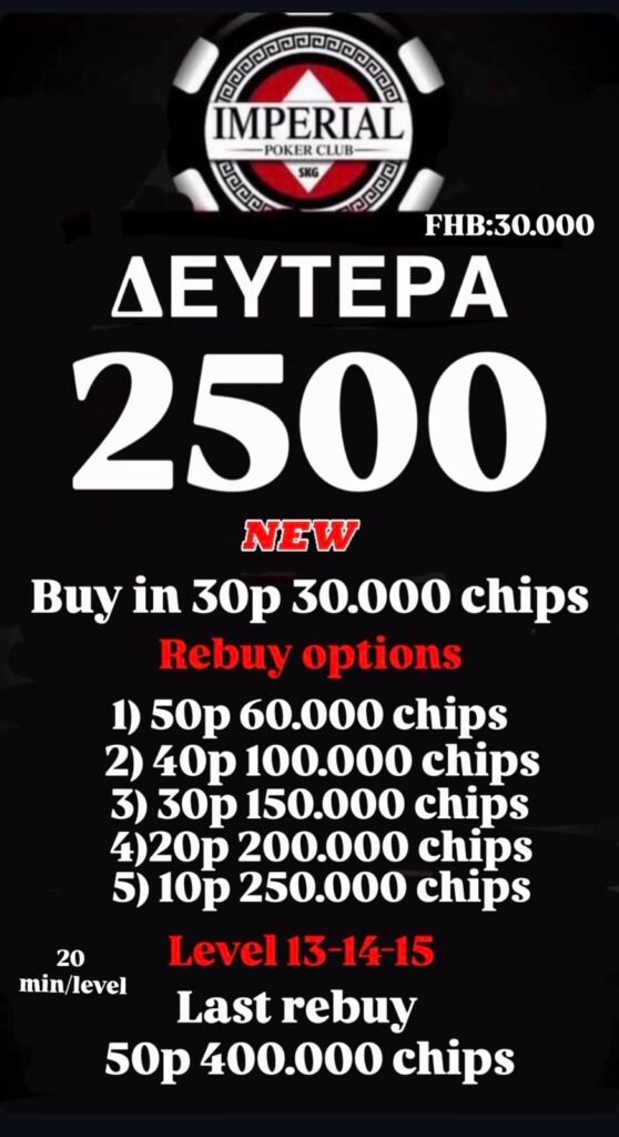 Το Imperial Poker Club παρουσιάζει ένα νέο και ανανεωμένο τουρνουά πόκερ, το Δευτέρα 2500, προσφέροντας στους παίκτες μια δυναμική δομή, πολλές επιλογές για rebuys και σημαντικές ευκαιρίες για μεγάλο stack.