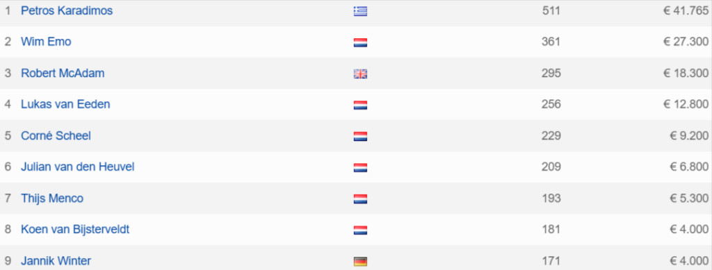 Η νίκη ήρθε σε €550 No-Limit Hold’em Re-entry event που συγκέντρωσε 417 συμμετοχές, με τον Καραδήμο να επικρατεί στο heads-up απέναντι στον Wim Emo. Για την πρωτιά του εξασφάλισε χρηματικό έπαθλο €41.765, καθώς και ένα πακέτο αξίας $5.000 για επόμενη διοργάνωση της σειράς.