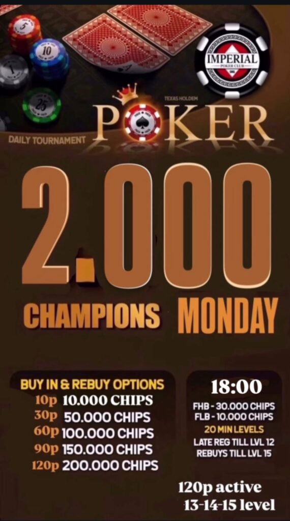 Με τουρνουά ξεκινάει σήμερα η εβδομάδα στο Imperial Poker Club με το  “2.000 Champions Monday”, ένα τουρνουά Texas Hold’em που αναμένεται να συγκεντρώσει έντονο ενδιαφέρον και αυξημένη συμμετοχή. Με ευέλικτη δομή buy-in και πολλές επιλογές rebuys, το τουρνουά δίνει σε όλους τους παίκτες τη δυνατότητα να διεκδικήσουν τη διάκριση μέχρι τέλους.