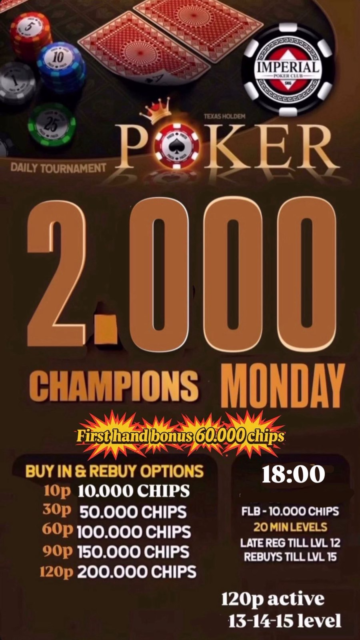 Με τουρνουά ξεκινάει σήμερα η εβδομάδα στο Imperial Poker Club με το “2.000 Champions Monday”, ένα τουρνουά Texas Hold’em που αναμένεται να συγκεντρώσει έντονο ενδιαφέρον και αυξημένη συμμετοχή. Με ευέλικτη δομή buy-in και πολλές επιλογές rebuys, το τουρνουά δίνει σε όλους τους παίκτες τη δυνατότητα να διεκδικήσουν τη διάκριση μέχρι τέλους.