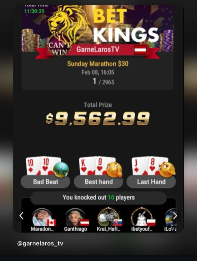 Μια ακόμη σημαντική online επιτυχία πέτυχε ο Γιώργος Γαρνέλης, ο οποίος κατέκτησε την 1η θέση στο $30 Sunday Marathon της BetKings, αφήνοντας πίσω του συνολικά 2.965 συμμετοχές. Αγωνιζόμενος με το nickname GarnelLarosTV, ο Έλληνας επαγγελματίας παίκτης επικράτησε στο φινάλε του τουρνουά και εξασφάλισε το κορυφαίο έπαθλο των $9.562,99, ολοκληρώνοντας μια μαραθώνια διοργάνωση με διάρκεια άνω των 11 ωρών.