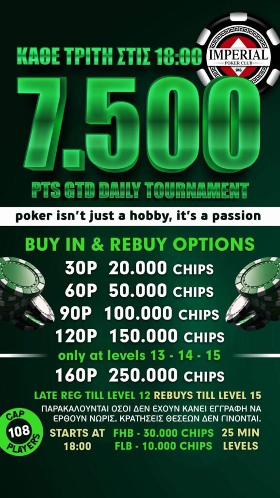 Η αγαπημένη συνήθεια της Τρίτης επιστρέφει δυναμικά! Το Imperial Poker Club υποδέχεται σήμερα το καθιερωμένο Tuesday Poker Night, με εγγυημένο prize pool 7.500p GTD και τη συμμετοχή να αναμένεται, όπως πάντα να ξεπεράσει τα πενταψήφια νούμερα.