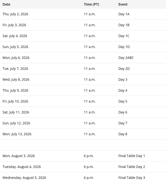Πρόγραμμα του Main Event του WSOP 2026
