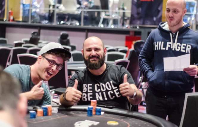 Στο Level 27 και σε Blinds 50,000/100,000 ο Γκατζάς από late position μπαίνει all in με άσους και δέχεται call από το BB με K♥ 9♦.
