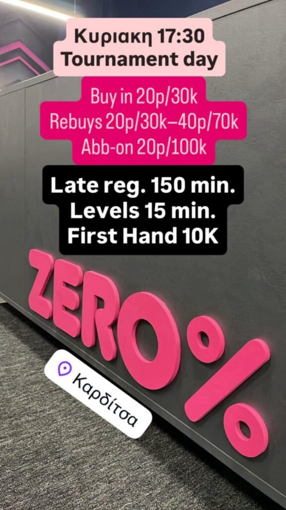 Ραντεβού με τη δράση δίνει την Κυριακή στις 17:30 το ZERO% Καρδίτσας, που φιλοξενεί το καθιερωμένο Tournament Day, προσκαλώντας τους φίλους του πόκερ σε ένα απόγευμα γεμάτο ένταση και ανταγωνισμό.